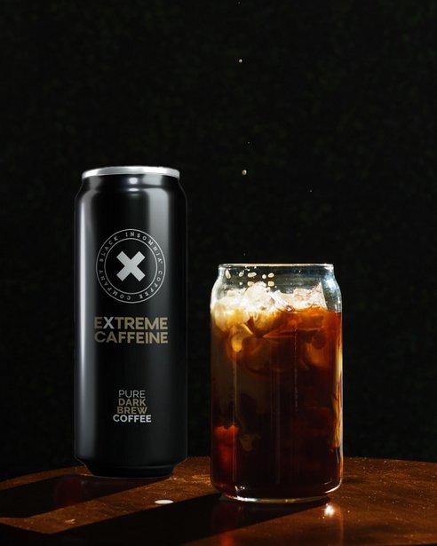 Black Insomnia Cold Brew is based on 90 Gram of coffee per litre, extracted in cold spring water over 14 hours, resulting in a very smooth yet super intense taste and a very high caffeine level. It comes in two versions; the sugar free Pure, and the sweetened version, with 3g of sugar per 100mls.